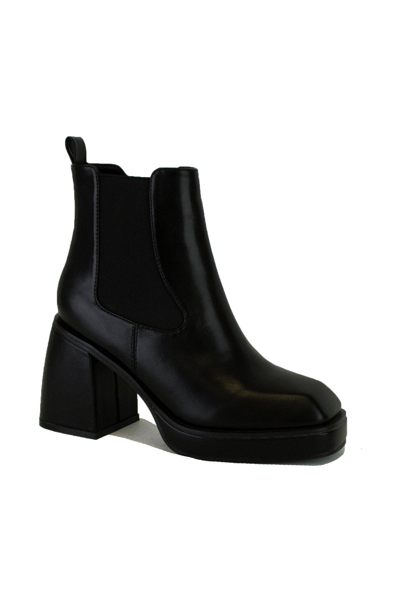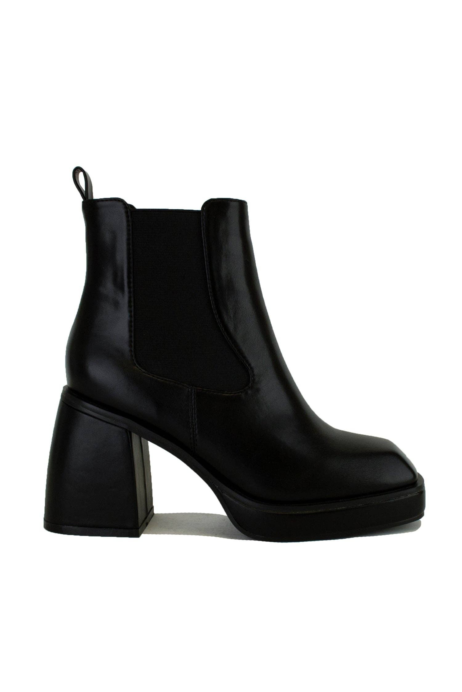 These boots offer a modern twist on the classic Chelsea boot with a bold platform and block heel. Featuring elastic side panels and a pull tab for easy wear, these boots are both stylish and functional. The squared toe and clean design make them a versatile choice for elevating any look.