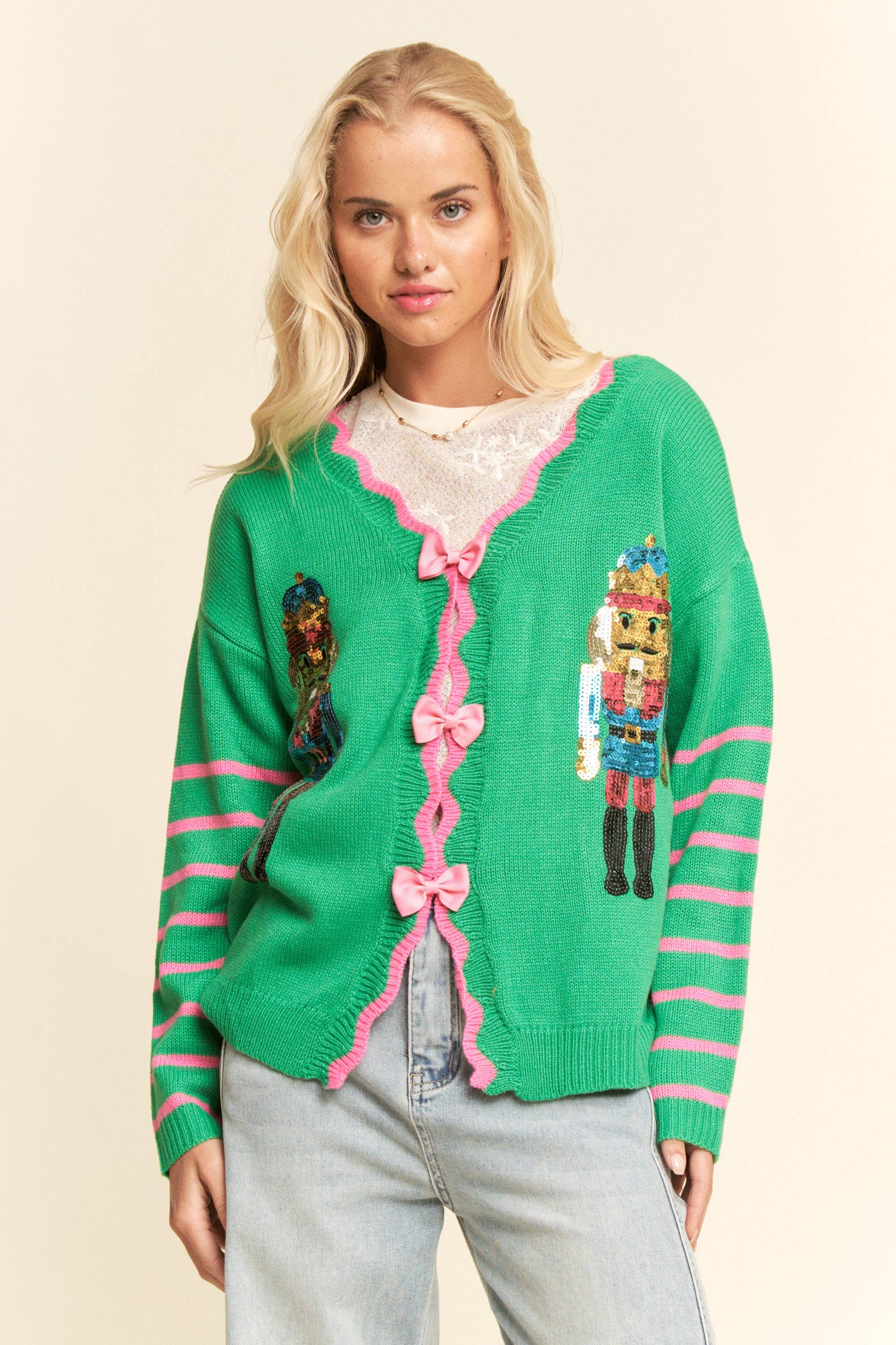 Bring festive charm to your boutique with this Nutcracker Sequin Cardigan, a playful yet refined knit featuring sparkling nutcracker motifs, striped sleeves, and bow-front details. Perfect for holiday collections, this cozy statement piece blends whimsy and wearability, making it a standout seasonal favorite for your customers. Model is wearing Small Height: 5'10" Bust : 34 Waist : 25” Hips : 35”